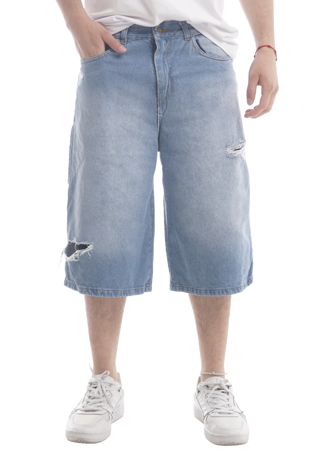 Bermuda de hombre Baggy. Rígida. Celeste localizada. Roturas